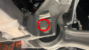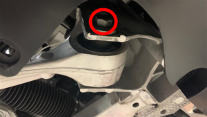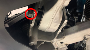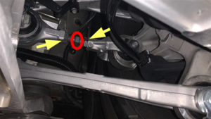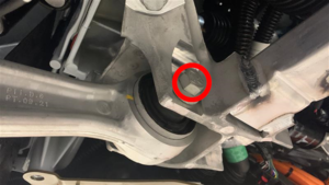 - Loosen the nut at the LH lower aft link to subframe bolt.