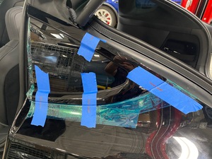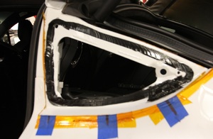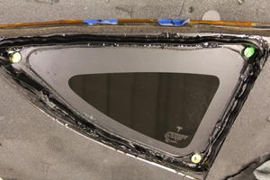 NoteVerify that the rear quarter glass is reusable.NoteLine up the glass with the previous marks.NoteApply tape to secure the rear quarter glass while the urethane cures.
