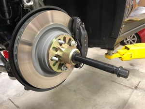 Install the lug nuts (x5) that attach the hub puller to the LH rear brake rotor.