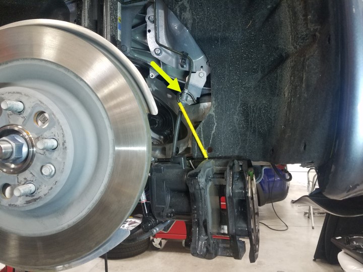 Loosen the LH rear brake caliper from the rotor, and then remove the bolts (x2) that attach the caliper to the rear knuckle.