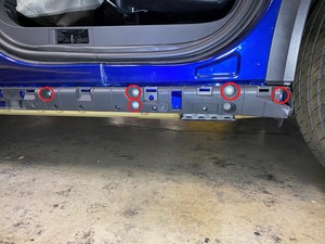 Install the screw and push clip that attach the front of the LH rocker panel to the