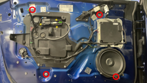 NoteRelease the bolts enough to lower the LH front door module to gain access to the door mirror harness behind.