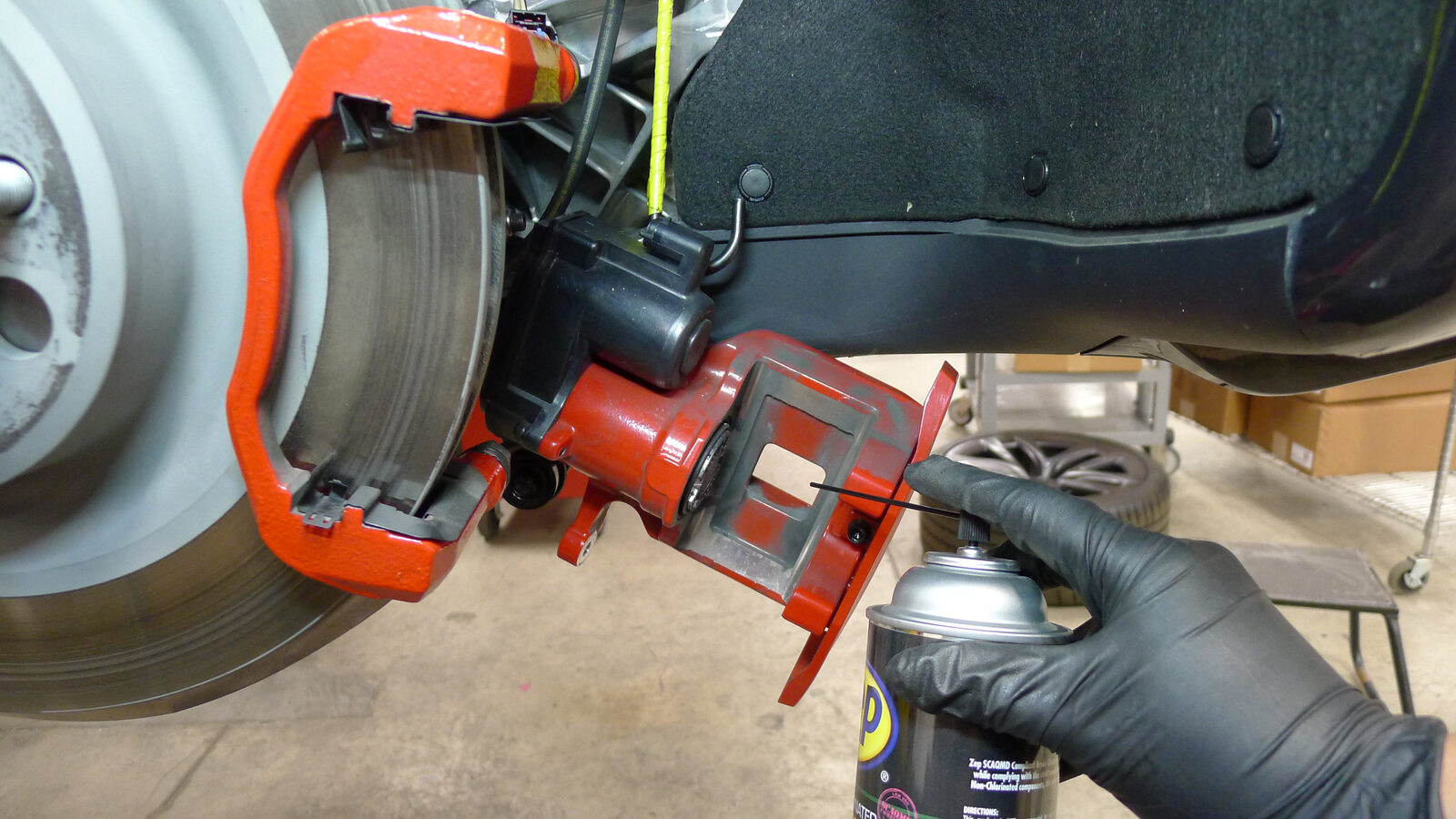 - Rotate the LH rear rotor 180 degrees, and then use the Tesla–approved brake cleaner to clean any debris from the rotor. Repeat.