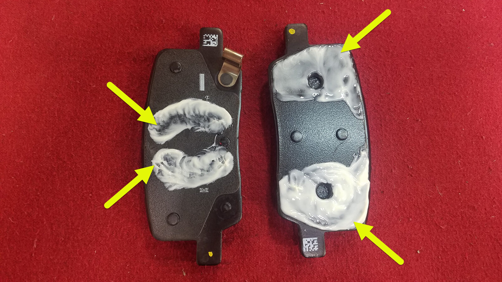 brake caliper lubricant to both brake pad's guide pin (x2) and piston (x2) contact