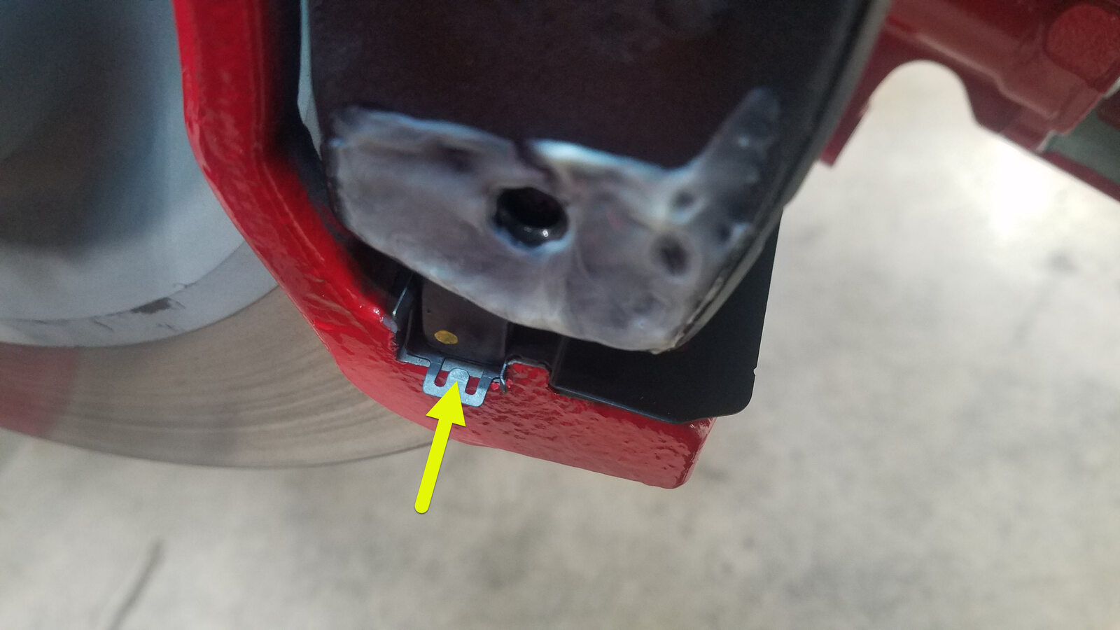 CAUTIONMake sure the brake pad clip rests on the brake pad bevel as pictured. Reposition or replace the brake pad clip as needed.