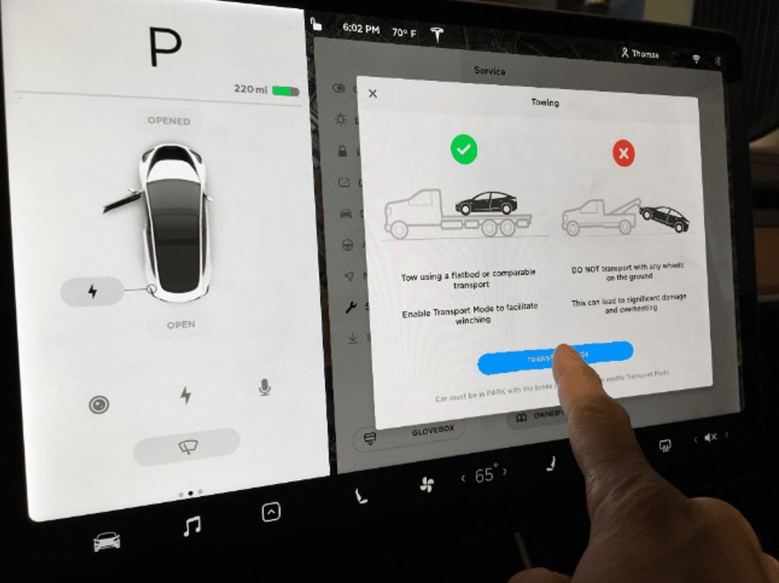 - Hold brake pedal and select park on UI to deactivate Transport Mode.