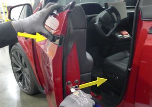 NotePush simultaneously on the exterior door release handle and push door latch open.
