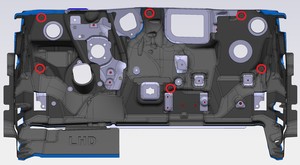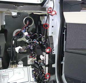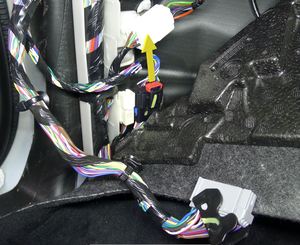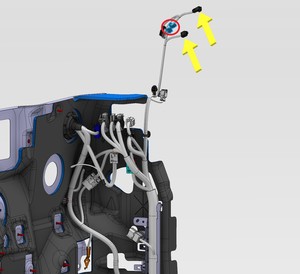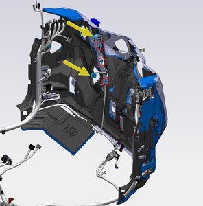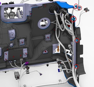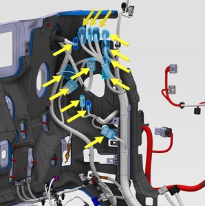 Note1x connector, 2x datums, 6x clips, Secure LH upper A-pillar harness, Align datums into IP sub assembly, Rotate upper A-pillar panel into position engaging clips fully.