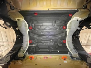 Position the rear motor bay noise absorber on the vehicle, and then install the clips (x6) that attach the noise absorber to the body.