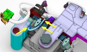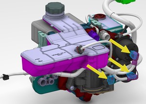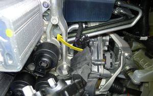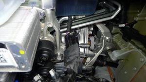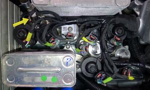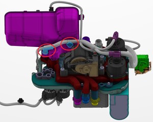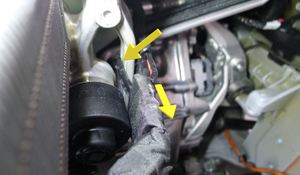 Secure clips securing heat pump harness at the bottom of coolant bottle
