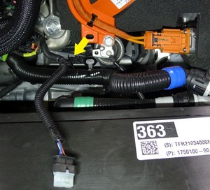Remove fastener securing AC compressor HV harness bracket to AC compressor