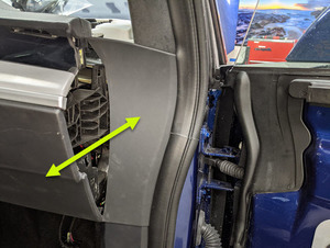Note2x clips, 3x datums, Release clips from upper A-pillar and IP sub assembly, Lift mid A-pillar trim out of lower A-pillar trim