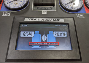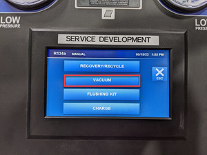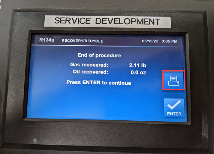 NoteEnter refrigerant account noted in the A/C recovery.NoteThe A/C machine chimes when recharge is complete.
