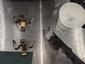 Use a hand brush and soapy water to clean the anti-rattle springs.