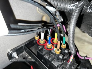 NoteRemove the white plugs when the air lines are ready to be installed.NoteFully insert each air line into the fitting. It should sit between the two white marks on the air lines. Verify air lines are properly seated by performing push-pull test. -