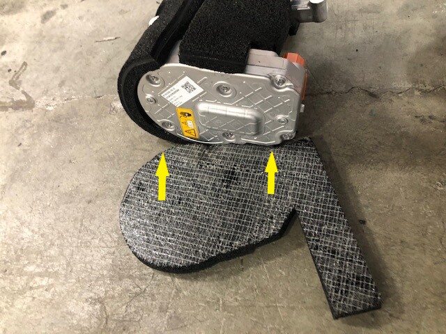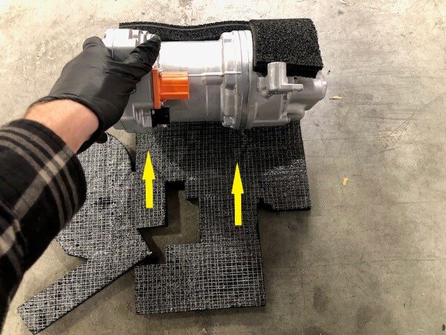 NoteInstall the new NVH blanket. Put the NVH acoustic cover down with the adhesive side facing up. Align the cut outs of the NVH acoustic cover to the suction port on the A/C compressor. Install the NVH acoustic cover around the suction port on the A/C compressor, then continue to wrap the NVH acoustic cover around the compressor.