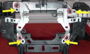 - Remove the front passenger knee airbag as an assembly. However, do not remove the components from the knee airbag assembly after the assembly has been removed from the instrument panel. See GUID-A1D9FA86-1206-4809-A20E-6E26D876BD31.html.