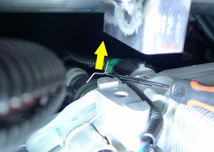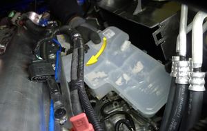 Place rag on top of front drive unit heat exchanger below plastic coolant manifold
