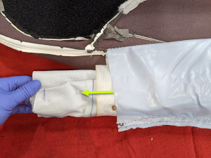 CAUTIONMake sure that the driver side airbag mounting studs extend out of the holes of the chute.CAUTIONHandle the airbag with extreme care when installing it into the airbag chute. The airbag is configured/folded in a specific manner and will need to be replaced if it is dropped, altered or manipulated in any way.NoteRefer to the following video for proper care when installing the driver side airbag into the airbag chute, and when installing the chute through the seat foam.
