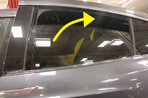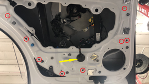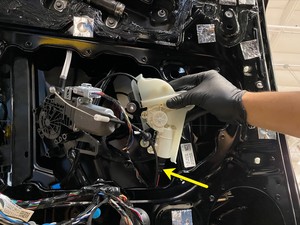 Note5x patched screws, T25, 3.5 Nm, Install new patched bolts, Carefully lift up airbag to access the lower screws, Place upper edge of fixed glass assembly in between cantrail seal, Position fixed glass to lineup with the rivnuts, Insert and secure fixed glass seal onto door assembly