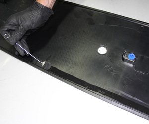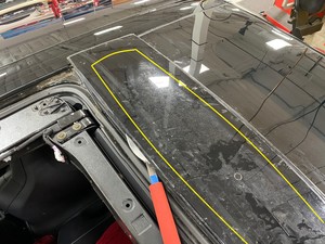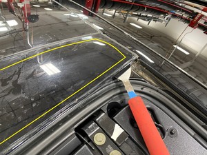 NoteStarting from the front, use a hydroblade to cut through and work around the center spine applique.NoteSeparate the urethane from the applique; partially lift the LH side of the applique to gain access to the RH side.NoteUse glass cleaner to lubricate the blade.NoteCarefully release the clips from the center spine applique, but do not damage the seal on the RH upper glass.