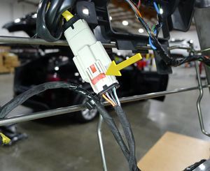 Connect the seat belt harness electrical connector, and then secure the locking tab.