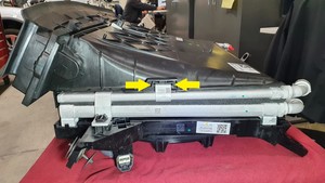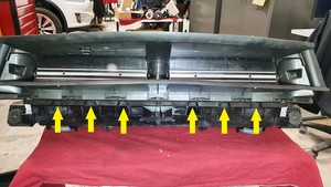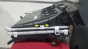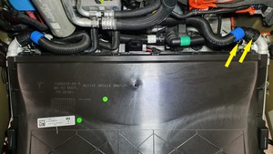 Position the active grille shutter on the cooling fan module, and then install the locking tabs (x12) and clips (x2) that attach the active grille shutter to the cooling fan module.