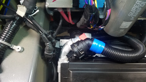 Position the radiator inlet and outlet hoses on the top RH side of the radiator, and then install the spring clips (x2) that attach the hoses to the radiator.