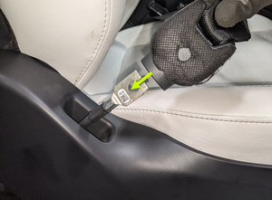 Position chair to gain access below seat bottom and connect LH side body harness to seat controller