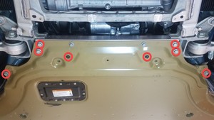 Remove bolts securing front skid plate to front subframe and remove skid plate