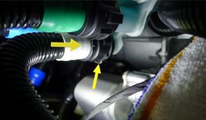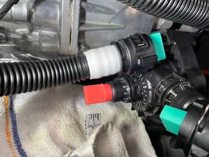 Note1x hose clip, 2x plugs, Plug both ends, Use absorbent material to cover connectors as required, Remove from vehicle