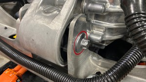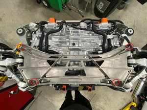 that attach the ground strap to the rear drive unit and rear subframe, and then remove