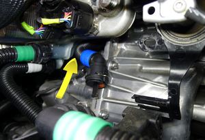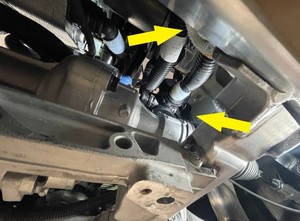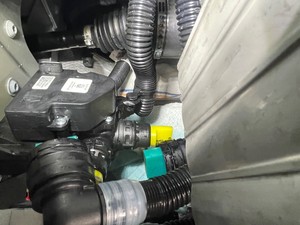 Guide thermal bar battery return hose between supermanifold and front drive unit and AC compressor bracket above PT coolant pump