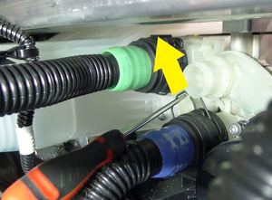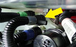 Release clip securing the supermanifold to battery pump supply hose from LV battery