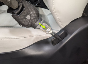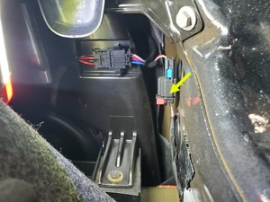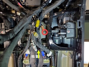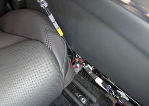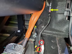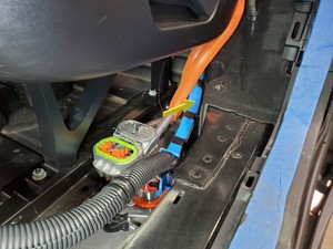 Position chair to gain access below seat bottom and connect LH side body harness to seat controller