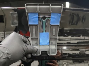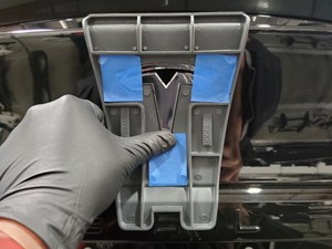 NoteDo not remove the masking tape from the front of the badge.NoteStarting from the bottom and working upwards, apply pressure and allow the badge to fully adhere to the trunk.