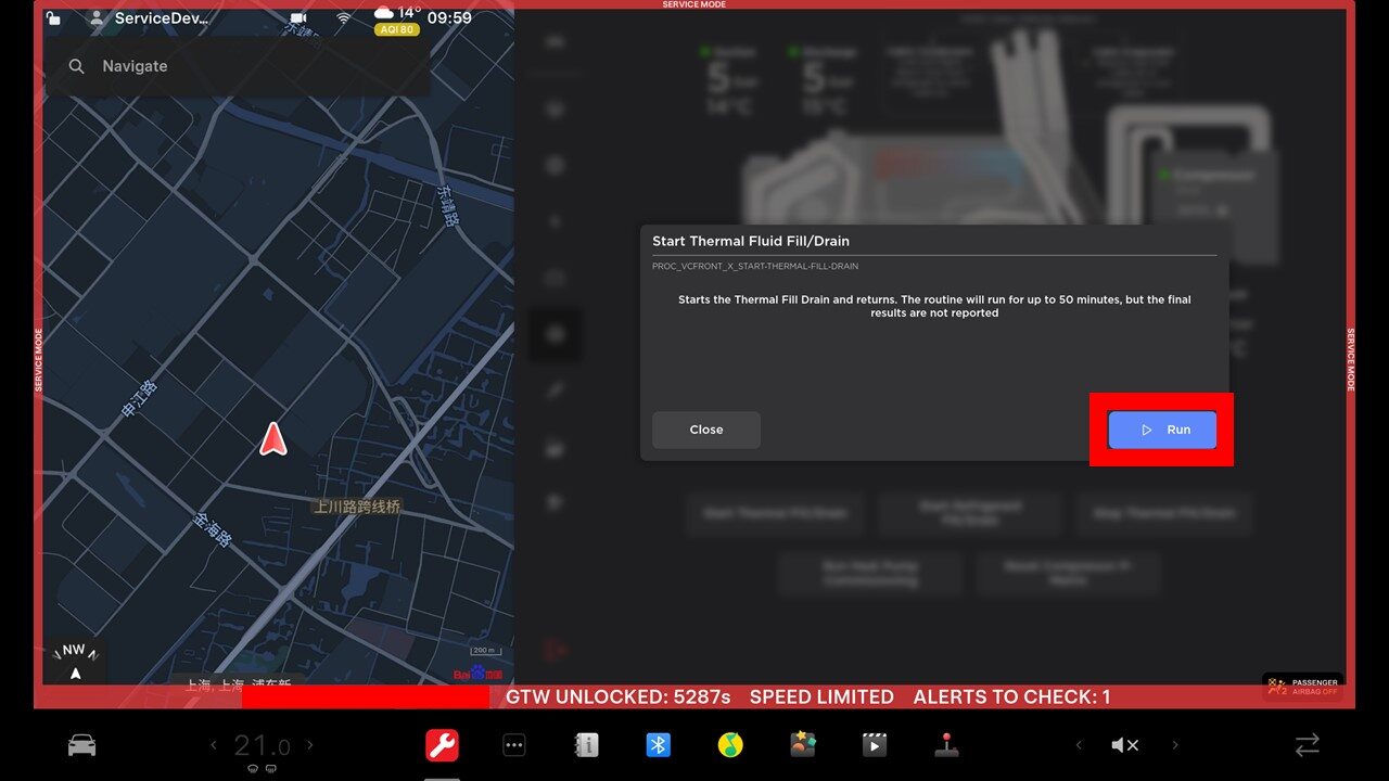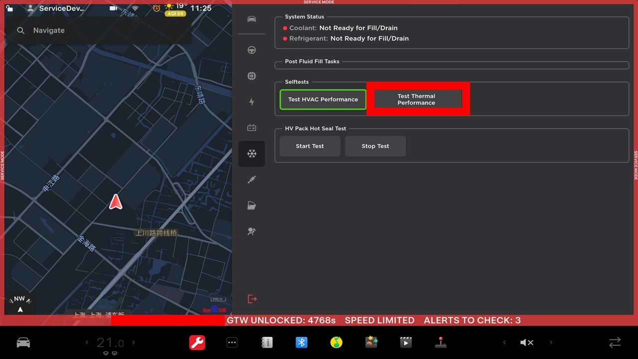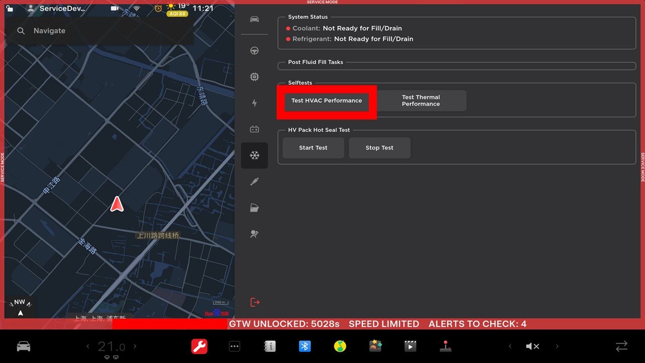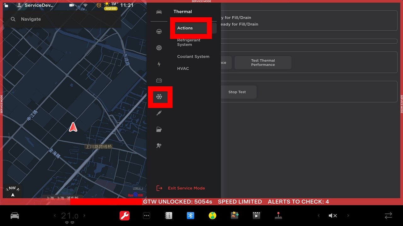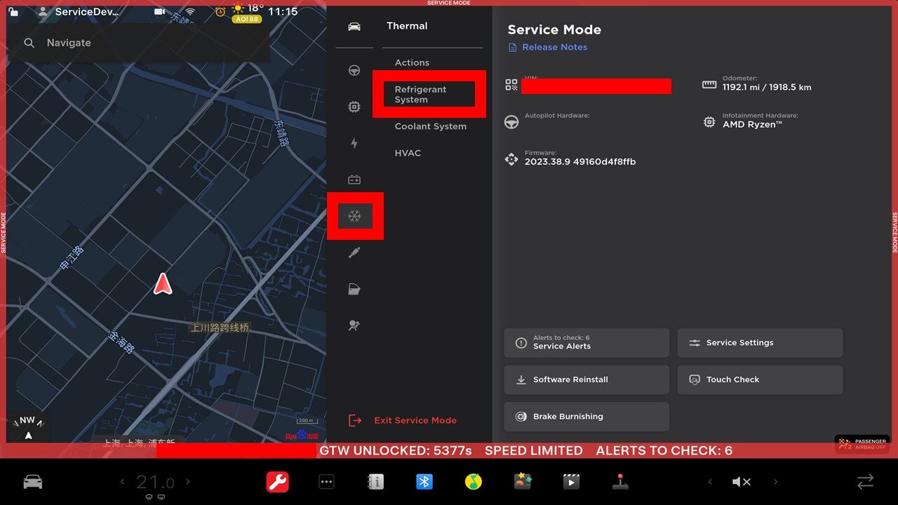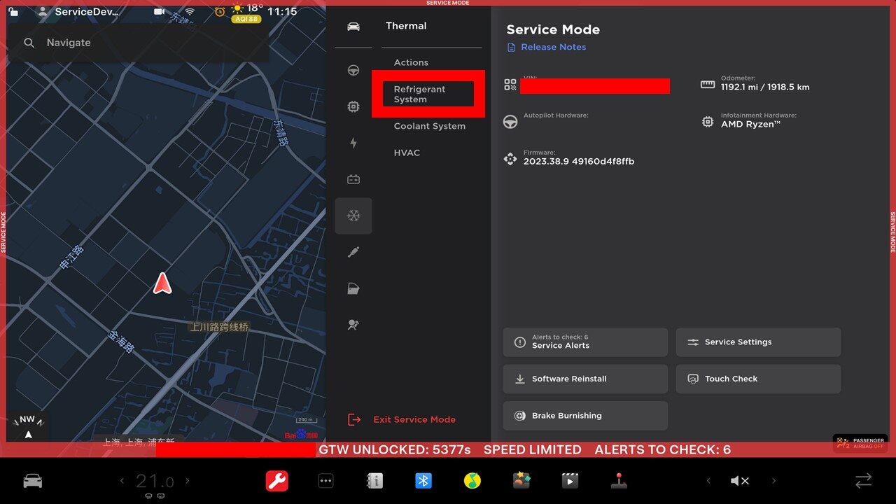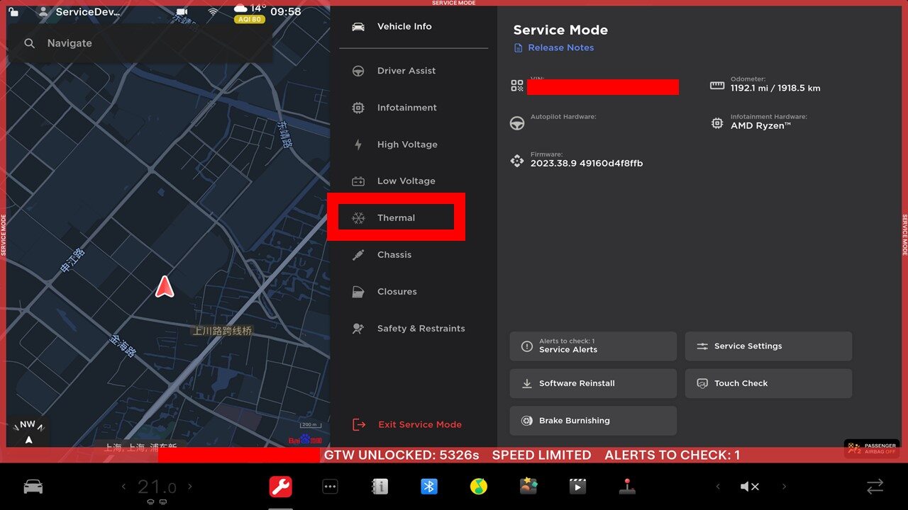NoteAfter vehicle has been put into "Service Mode", place keycard on center console to turn on drive rails, hold down the brake pedal, while keep pressing right hand signal button simultaneously for at least 10 seconds, "GTW UNLOCKING" should pop up on the UI right next to the VIN during these 10 seconds, once gateway is unlocked "GTW UNLOCKED 5400" will be displayed on the UI next to the VIN, the gateway will remain unlocked for 90 minutes, follow steps on Toolbox article #5582900 for any additional information