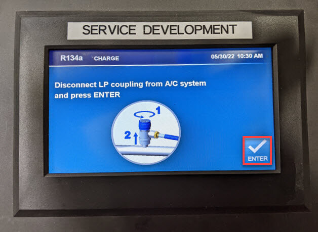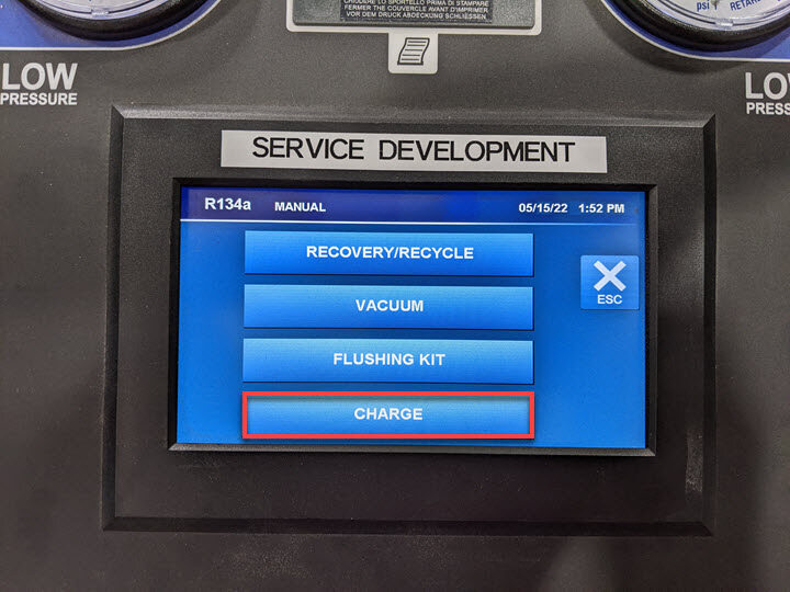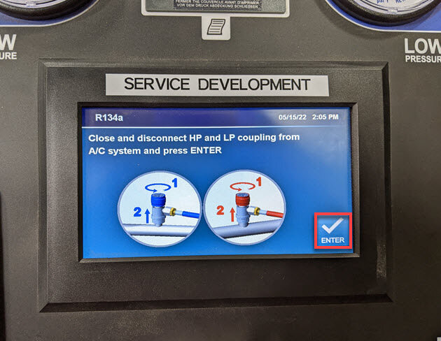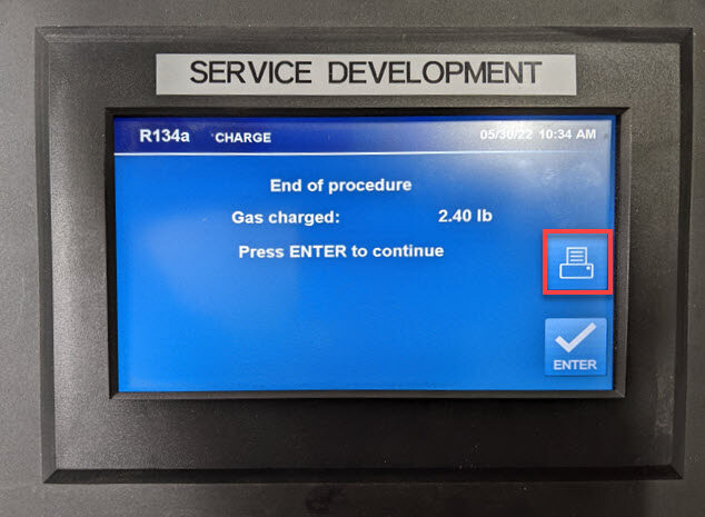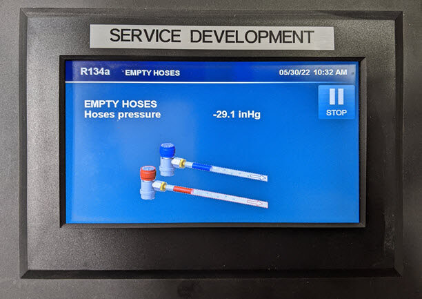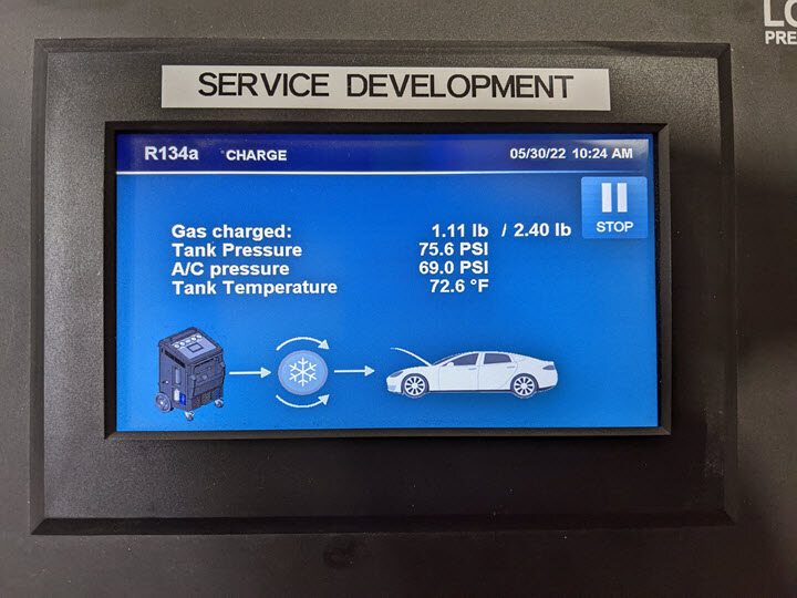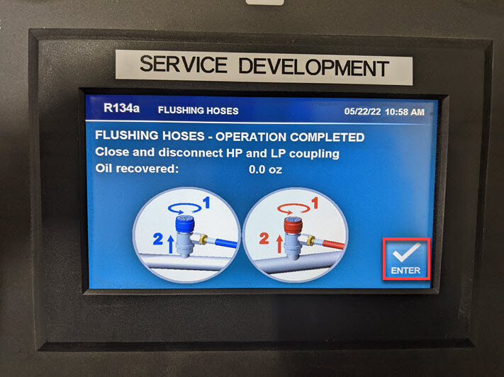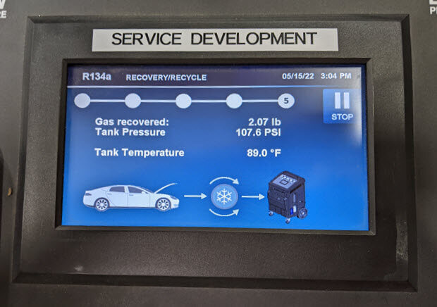 NoteTouch time only: Note the amount of refrigerant and oil recovered, Manual Menu > Recovery/Recycle > Verify hose connections, Machine will chime once process is complete, Vehicle may be left unattended, Note or print the amount of refrigerant and oil recovered, Refrigerant recovered should be ~2.24 lb (1.02 kg), Oil recovered should be ~0.3 oz (8.87 mL), If drained oil level increased more than 1.01 oz (30 mL) refer to drained oil loss chart https://toolbox.teslamotors.com/articles/353700