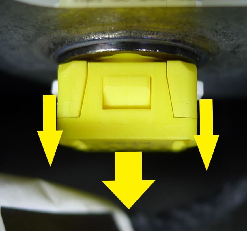 Note2x datums, 2x spring clip, Position driver air bag onto yoke steering wheel, Align datums onto the clips, Press down on one side of the air bag until clip is fully seated, then repeat on other side, You should hear an audible click, Perform pull test on each side of driver air bag assembly, Confirm the gap and space between driver air bag assembly to yoke steering wheel is symmetrical