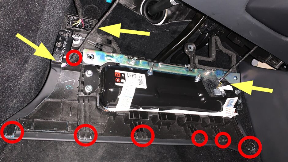 Note1x clip, 3x connectors, 6x tabs, Hook tabs before fully seating, Use caution not to damage the connector/harness, Support the knee air bag while connecting the connectors