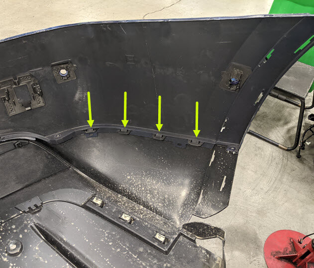 Note2x connectors, 24x tabs, 1st release LH and RH fascia edges from fender brackets, 2nd Pull fascia rearward to detach from vehicle, 3rd reach in and disconnect both BLE connectors before setting fascia on the bench, Recommended assistance, Place on protected surface
