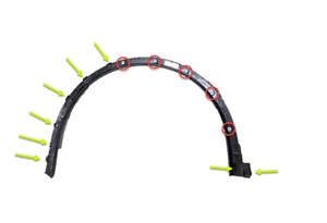 clips (x5) and tabs (x9) that attach the LH front fender garnish and fairing assembly to
