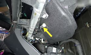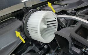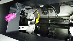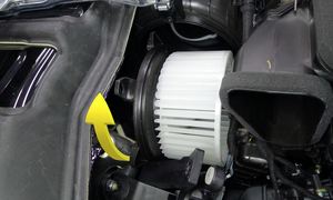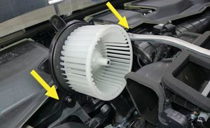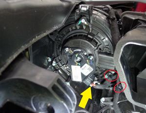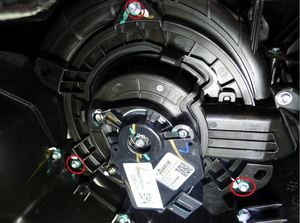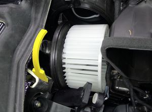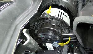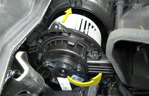 NotePull motor out of HVAC assembly, Rotate motor up and around the HVAC unit assembly and between brake pedal assembly