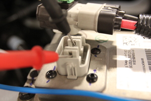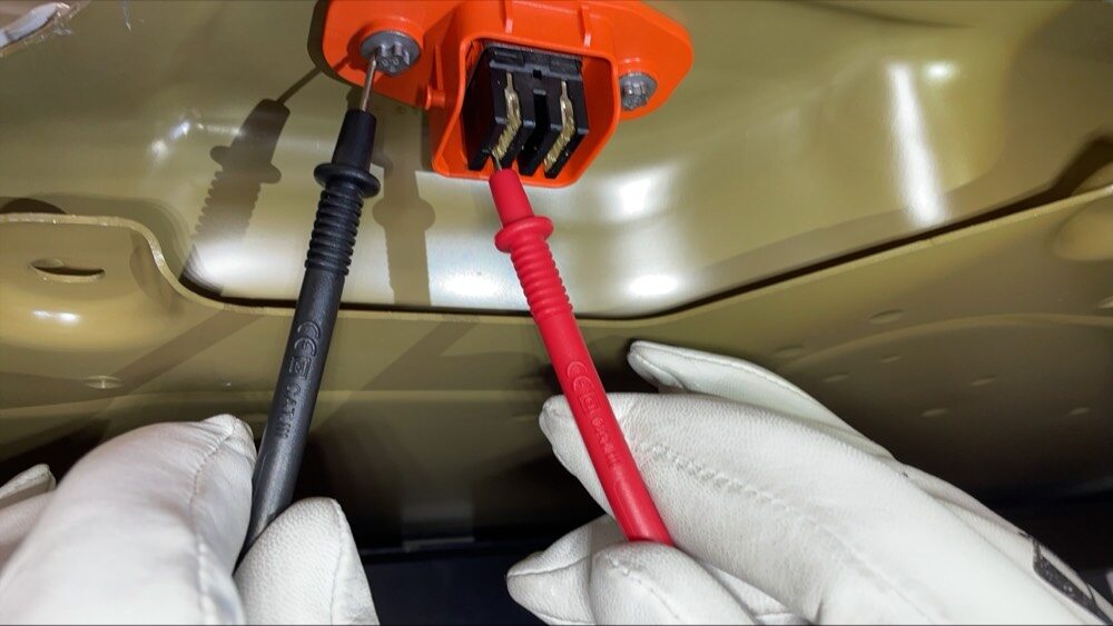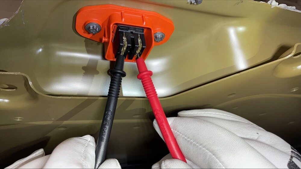 NoteVerify meter is zeroed out before performing measurement, Measure single cable. Verify ammeter is installed in correct direction. If current > 0.5A do not proceed with disconnecting HV connector. In this case, start vehicle electrical isolation again to make sure that all was properly shut down. If current < 0.5A, Ok to disconnect and check voltage at HV plug on the battery side.