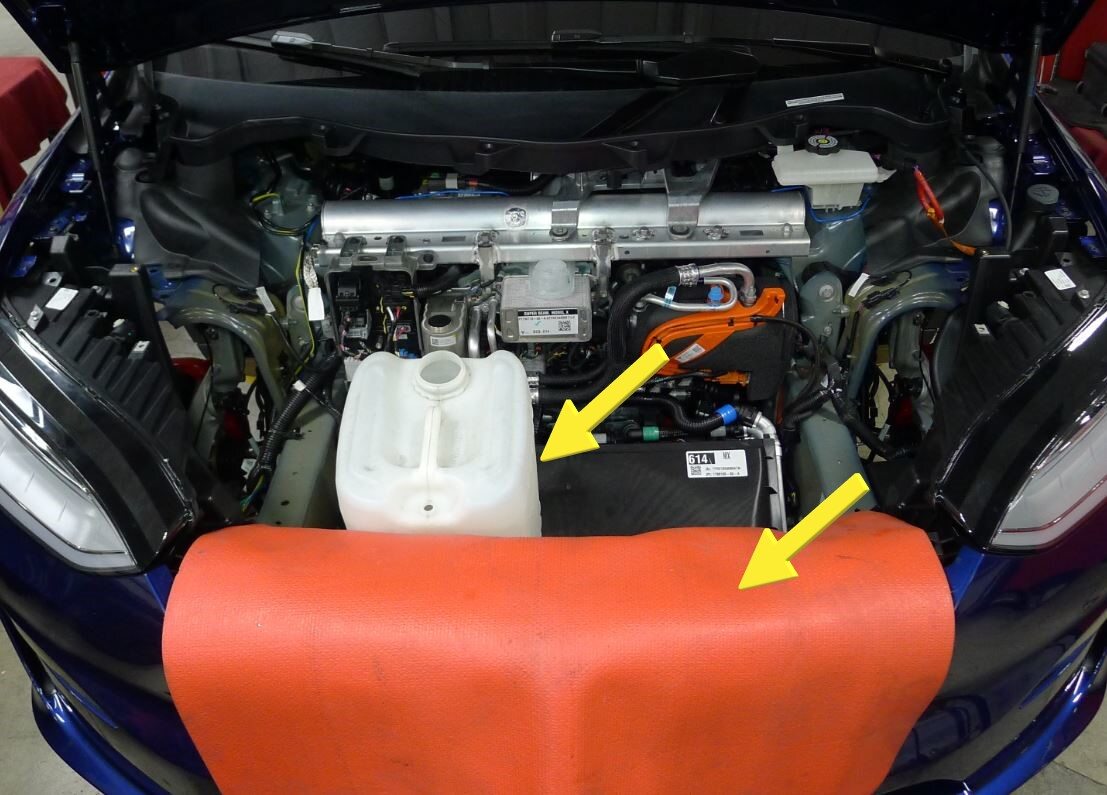 NoteCFM fan shroud assembly cannot support a full coolant container, Ensure overflow container is empty, Place fender cover over FEM and front fascia