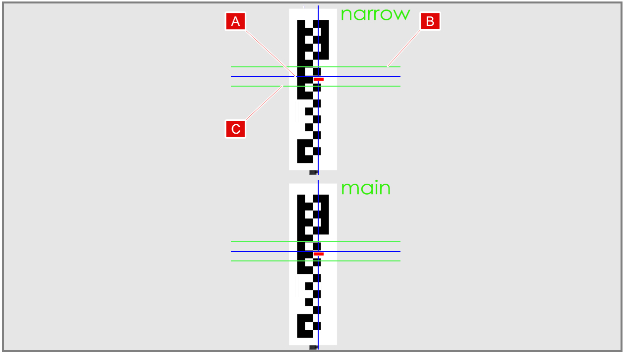 - If the top of the red tape (A) is between the two green lines (B and C), the forward facing camera is within calibration. Go to step 17.