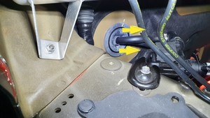 Install the car computer supply hoses back through the firewall towards the car computer cold-plate assembly, and then install the coolant hose clamps on the hoses.