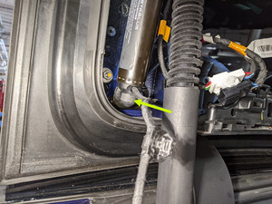 Secure the clips (x2) that attach the LH falcon wing door secondary strut harness to the door assembly.