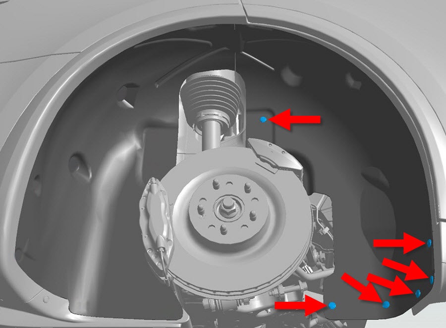 Release the rear push clips (x7) that secure the front wheel arch liner to the