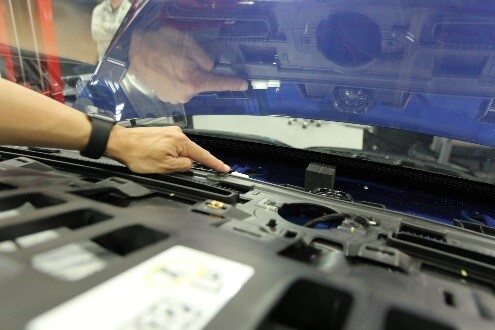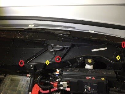 Note(x5) push clips, (x1) harness edge clip, (x1) windshield washer hose, (x1) cowl drain tube